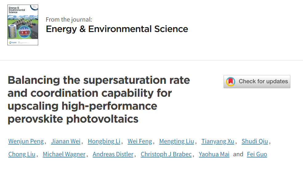 近日,六合彩心水论坛 新能源技术研究院在能源领域顶级期刊Energy & Environmental Science(2025年IF=30.8)上发表标题为“Balancing the supersaturation rate and coordination capability for upscaling high-performance perovskite photovoltaics”的研究成果。新能源技术研究院麦耀华教授和郭飞研究员、德国埃尔朗根-纽伦堡大学邱舒迪博士和Christoph J. Brabec教授为共同通讯作者。