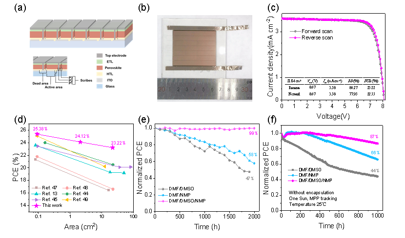 为进一步验证结晶调控策略的可扩展性,团队与广东脉络能源科技有限公司合作,制备了面积为21.84 cm²的组件,效率达到了23.22%。该效率在目前已报道的同类型组件中位居前列,显著缩小了实验室电池与大面积组件之间的效率差距。