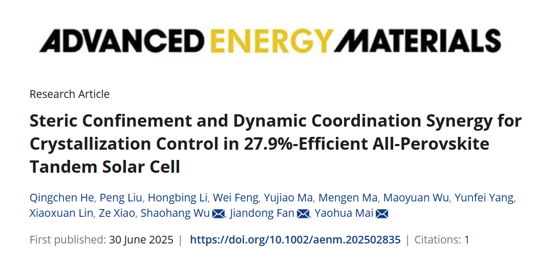 近日,六合彩心水论坛 新能源技术研究院的麦耀华教授团队,联合广东脉络能源科技有限公司,在Advanced Energy Materials(影响因子:26.8))期刊发表高效率全钙钛矿叠层电池成果,题为“Steric Confinement and Dynamic Coordination Synergy for Crystallization Control in 27.9%-Efficient All Perovskite Tandem Solar Cell”。博士研究生何青辰和硕士研究生刘鹏为本论文共同第一作者,范建东教授、吴绍航副研究员和麦耀华教授为文章共同通讯作者,暨南大学和广东脉络能源科技有限公司为通讯单位。